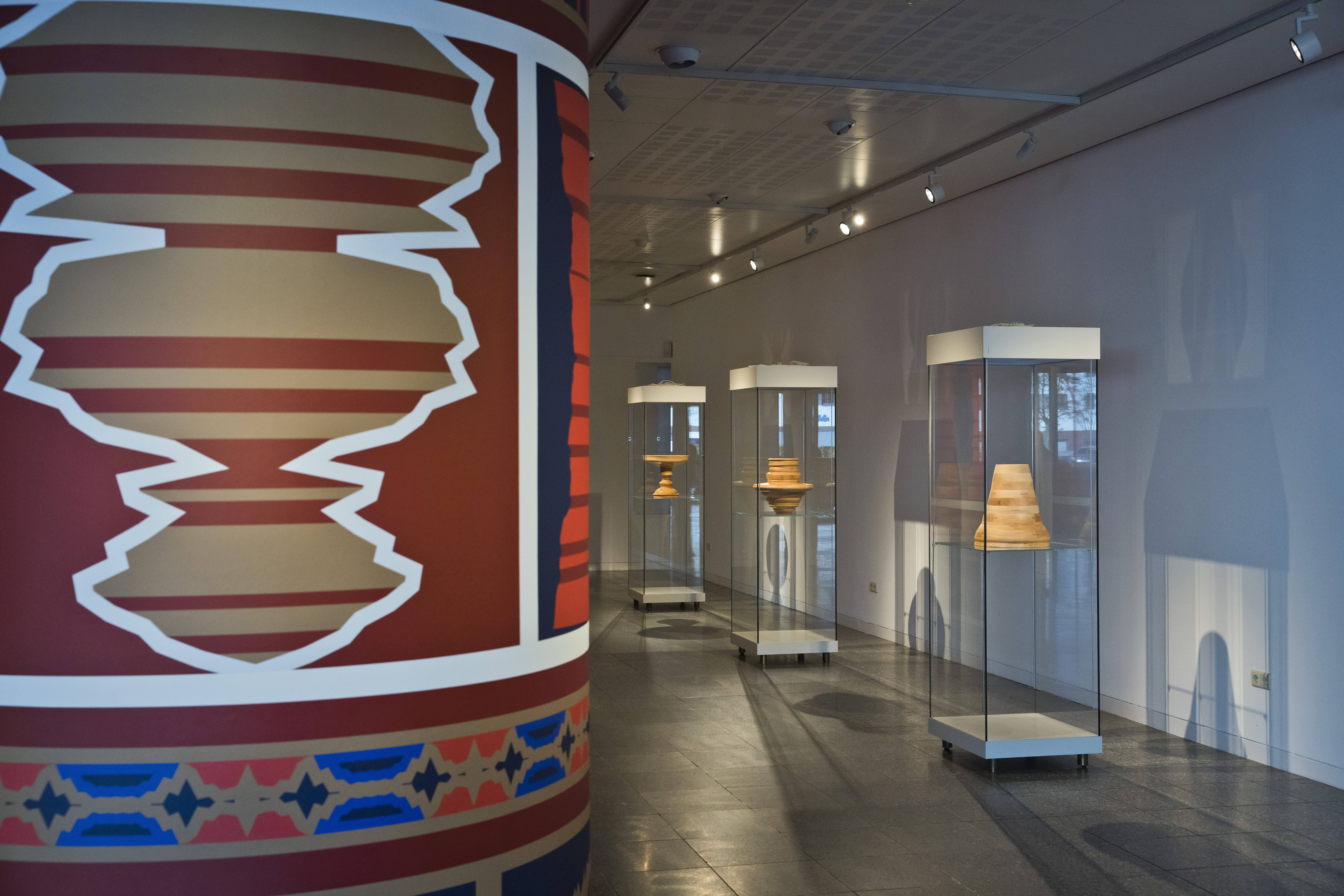 Dabei greift die Künstlerin mit Holz- und Keramikskulpturen, die an historische Vasen und Vorratsbehälter, und in Drucken, die entfernt an Wandteppiche und antike Säulenbemalungen erinnern, traditionelle kunsthandwerkliche Techniken wie Töpfern, Schnitzen, Bemalen und Weben auf. Die Objekte sind jedoch nicht handgemacht, vielmehr sind ihre Formen, ornamentale Rotationskörper, maschinell errechnet und erstellt. Sie basieren auf computergenerierten Übersetzungen von offiziellen Daten der Weltbank, der UNESCO, UNO und EU, die globale Prozesse der Gegenwart erfassen, in zwei- und dreidimensionale Strukturen. Diese Objekte ergänzt die Künstlerin durch ein Video und eine Soundinstallation, zeitgenössische Medien, in der die zugrundeliegenden Daten in Licht- und Tonwellen transformiert sind.